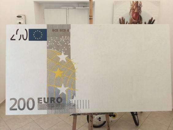 On the other hand, the number two hundred is painted three times on the same euro banknote, to concretize the materialization of the number three, the latter symbol of completeness and the incarnation of the word itself.
